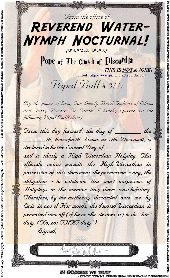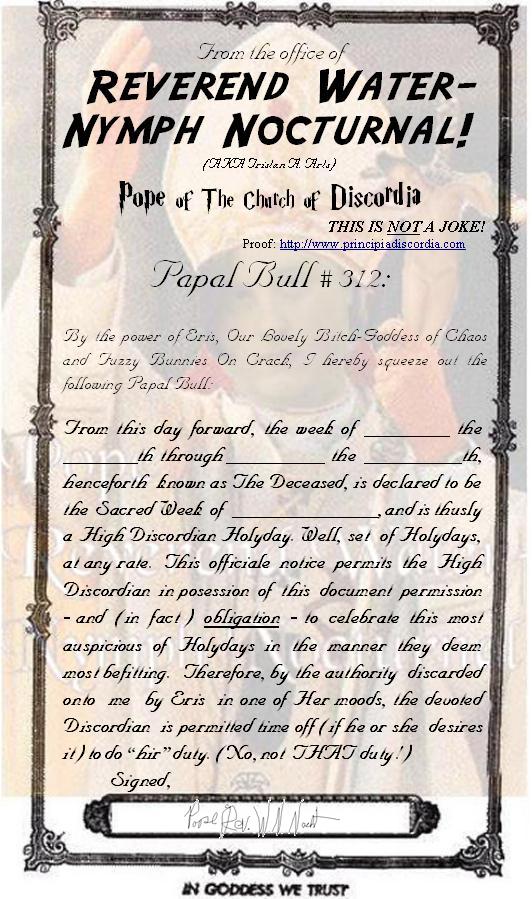 Papal Bull #311: Ahnai Ihndohn (For getting a day off of work by making your own holyday.)