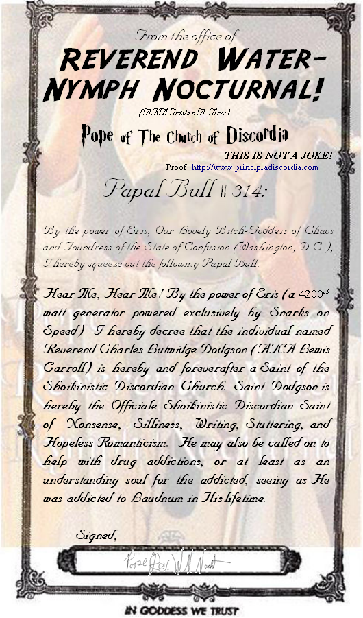Papal Bull #314: Ahnai-Maak Seh Sahn-Bahn (Tahl) Declaring the Sainthood of Saint Charles L. Dodgson (AKA Lewis Carroll)