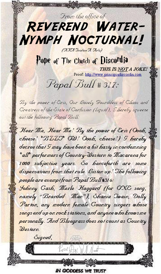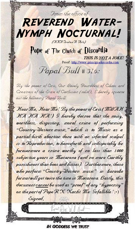 Papal Bull #316: Ben Maghl-Maak Seh La Dah’ah’rah Seh La Bahn’moiulj Seh La Sahn’suin’tohn Declaring that playing Country Western "music" as a career is a Macarena-worthy offense. DISPENSATIONS FROM THE ABOVE LAW: Papal Bull #317: Fii Krainah Sii'Juug Foht Vahzii Declaring an exception to bull #316 for several people.