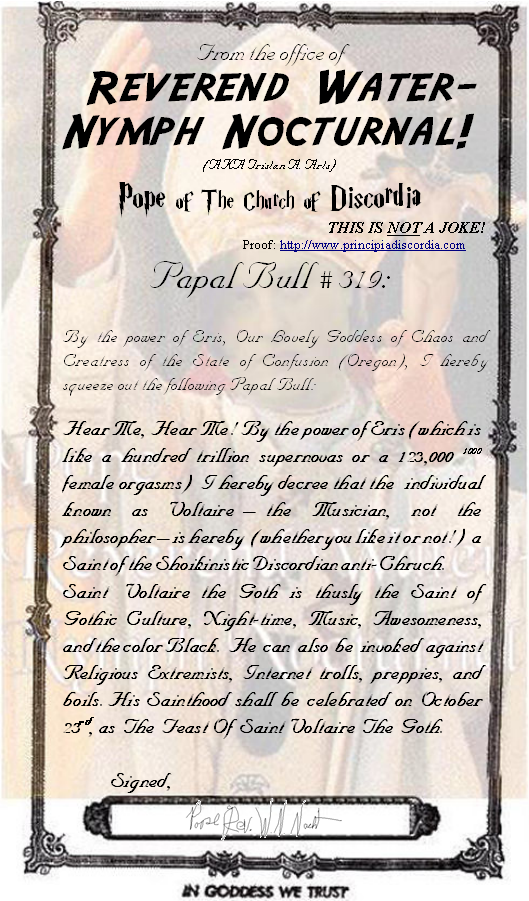 Papal Bull #319: Ahnai-Maak Seh Sahn-Bahn (Kahl) Declaring the Sainthood of Saint Voltaire (the Goth Musician, not the Philosopher)