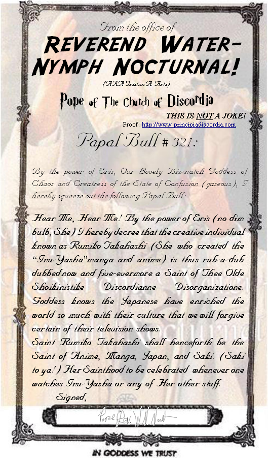 Papal Bull #321: Ahnai-Maak Seh Sahn-Bahn (Niama) Declaring the Sainthood of Saint Rumiko Takahashi (Creatress of the manga/anime "Inu-Yasha")