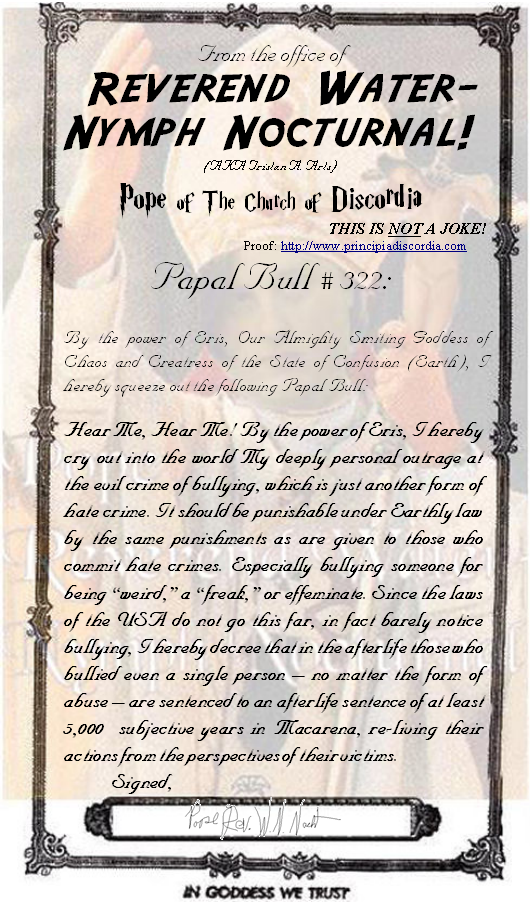 Papal Bull #:322 Lumin MaGl da-Bahn (Ahl) Declaring bullying of someone for any reason to be a crime worthy of 5,000 subjective years in Macarena.