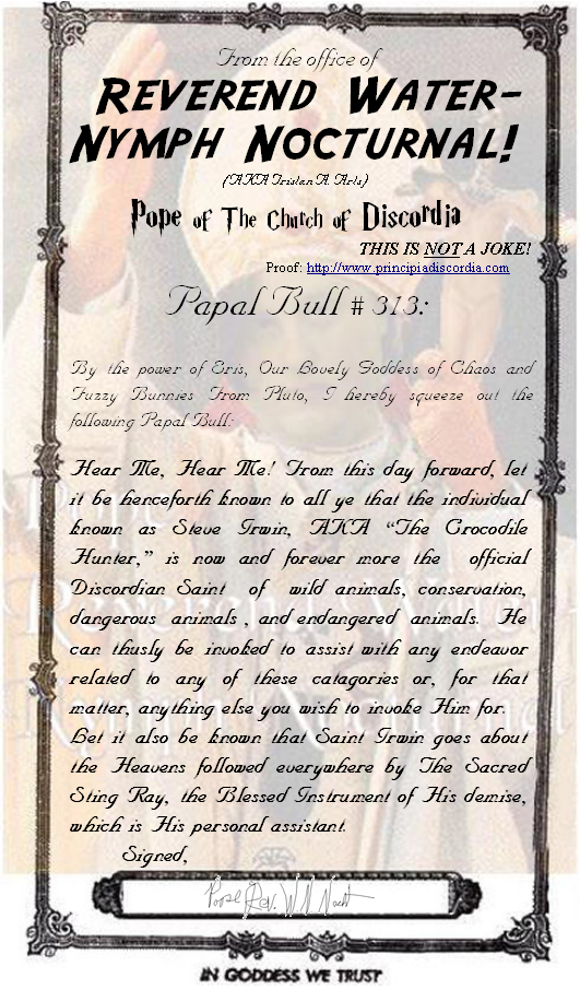 Papal Bull #313: Ahnai-Maak Seh Sahn-Bahn (Ahl) Declaring the Sainthood of Saint Steve Irwin (AKA The Crocodile Hunter.)