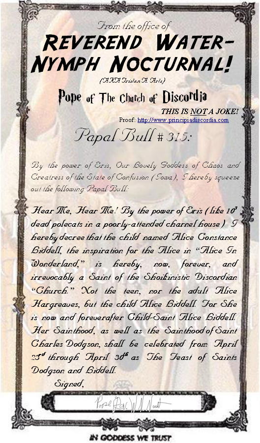 Papal Bull #315: Ahnai-Maak Seh Sahn-Bahn (Zahl) Declaring the Sainthood of Saint Alice Liddell (Inspiration for "Alice In Wonderland.")