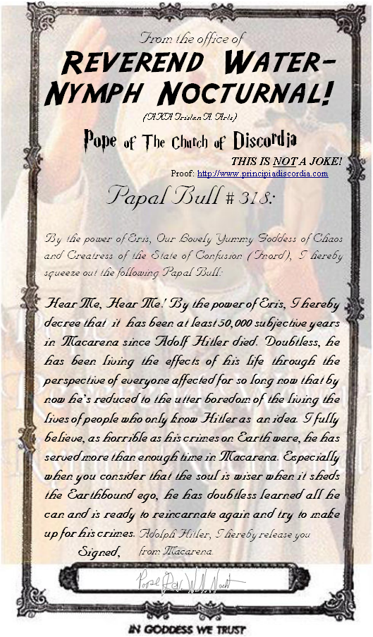 Papal Bull #:318 Ben Krainah Sii'Juug Seh Adolf Hitler Declaring the release from Macarena of Adolf Hitler after 50,000 subjective years in Macarena.