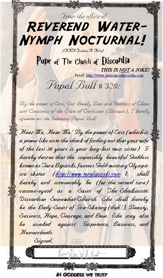 Papal Bull #320: Ahnai-Maak Seh Sahn-Bahn (Mahl) Declaring the Sainthood of Saint Tara Lipinski (Professional Olympic-Gold-Winning Ice-Skating Goddess)