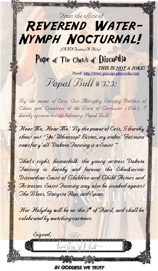 Papal Bull #323: Ahnai-Maak Seh Sahn-Bahn (Kukiino) Declaring the Sainthood of Saint Dakota Fanning (Young Oscar-Winning Actress)