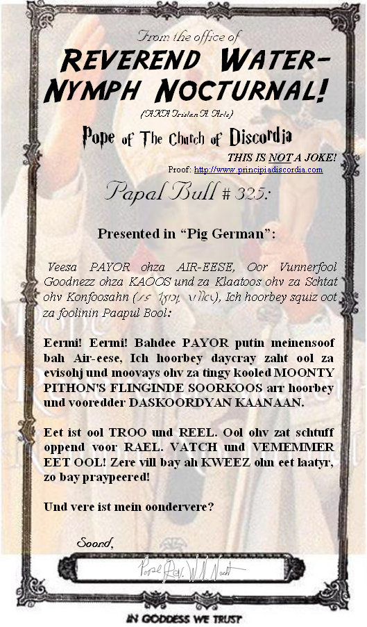 Papal Bull #:325 Ben Nogwahl-maik Seh Monty Python's Flying Circus Declaring Monty Python's Flying Circus to be Discordian Canon.