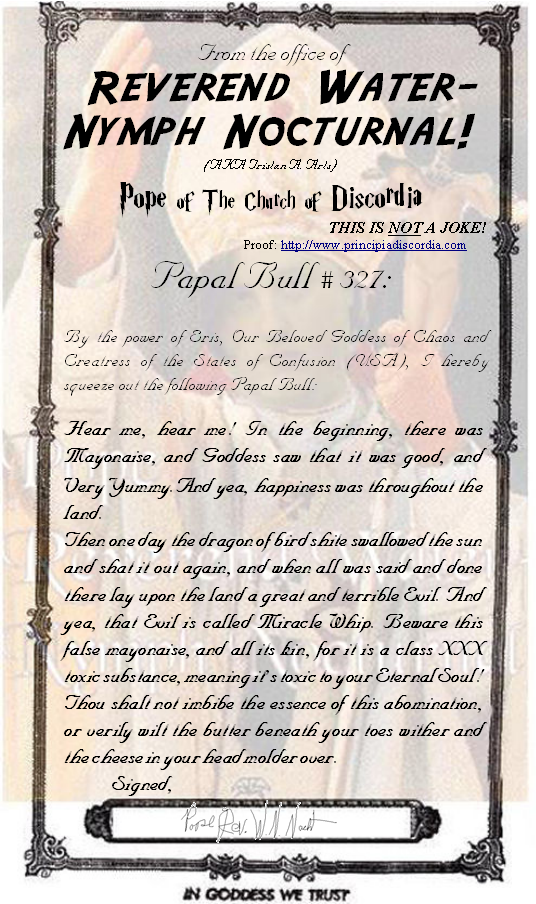 Papal Bull #:327 Lumin la MaGl-maik seh Miracle Whip NEW! Declaring that Real Mayonnaise is Divine, and Miracle Whip is a False Mayonnaise that is Blasphemy against Goddess.